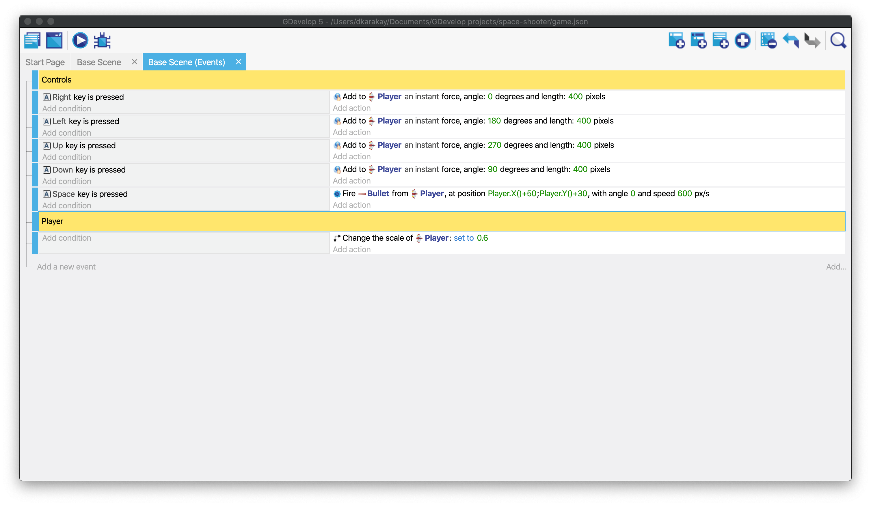 The player spaceship is a bit too big. We could resize it in the scene editor, but for this tutorial we'll use events. Click on Add a new action to change the scale of the player. Then, select the Player and Scale. Fill the value with 0.6.